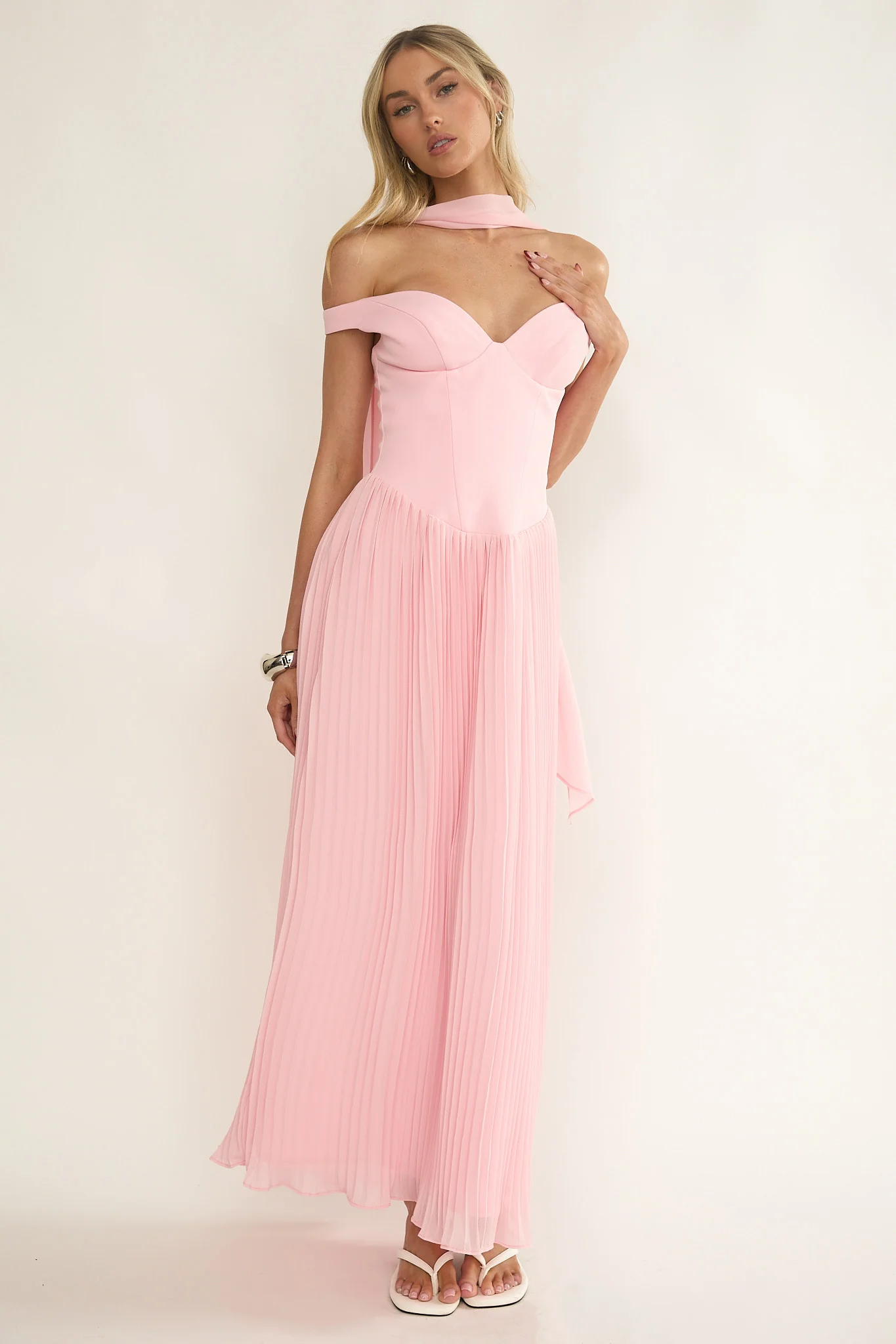 Quinnae Off-Shoulder Accordion Pleat Maxi Dress Pink