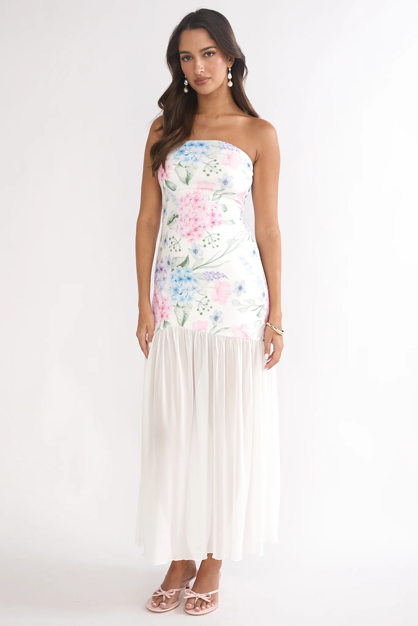 Wilma Sheer Hem Strapless Maxi Dress Flowers Blue