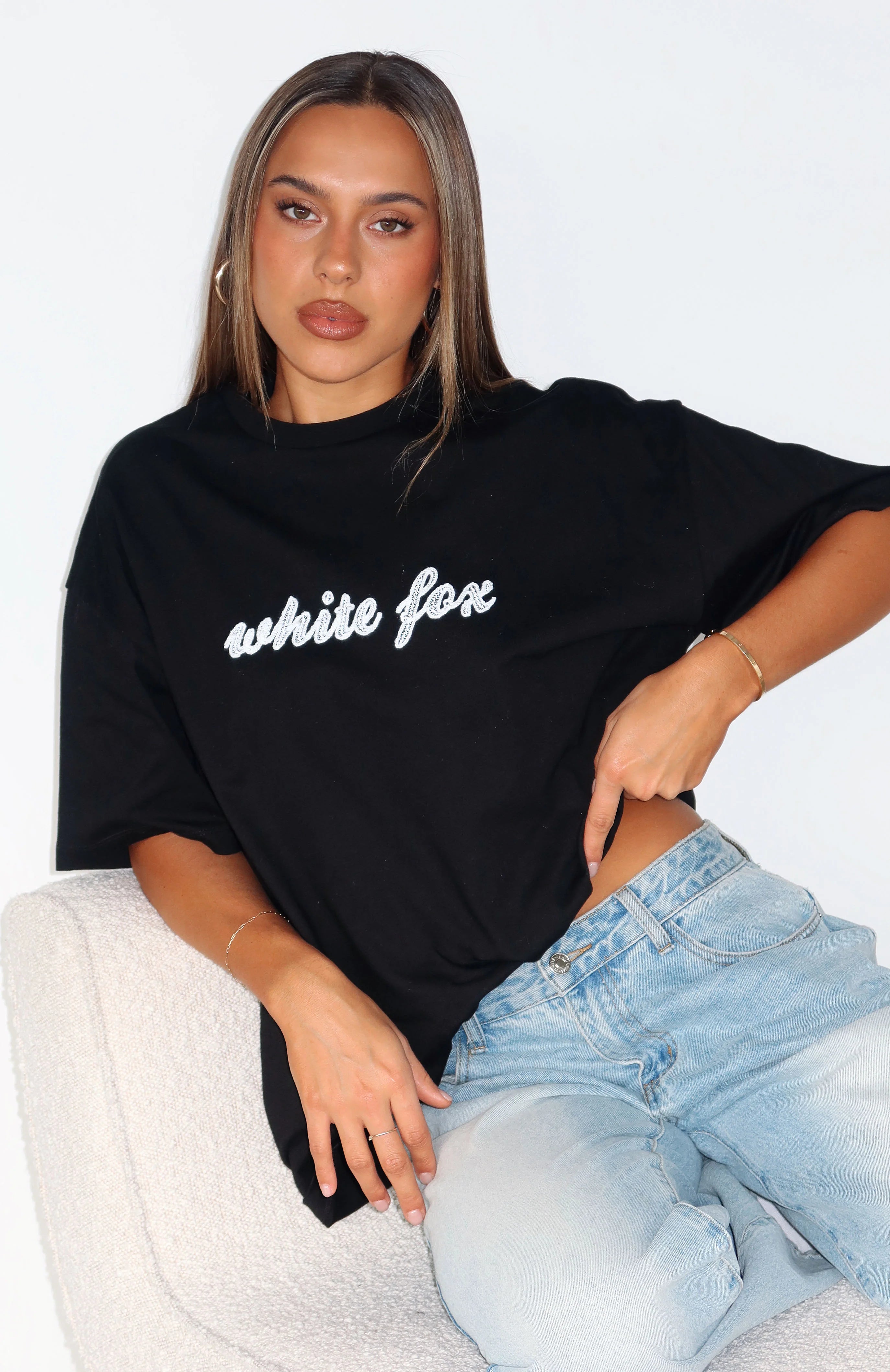 Stay effortlessly cool in the Call On You Oversized Tee in Black. Features a round neckline, slouched shoulders, short sleeve, oversized fit and stitched cursive White fox text centre front. Pair with sweatpants for a comfy, laid-back vibe perfect for casual days or layering up!