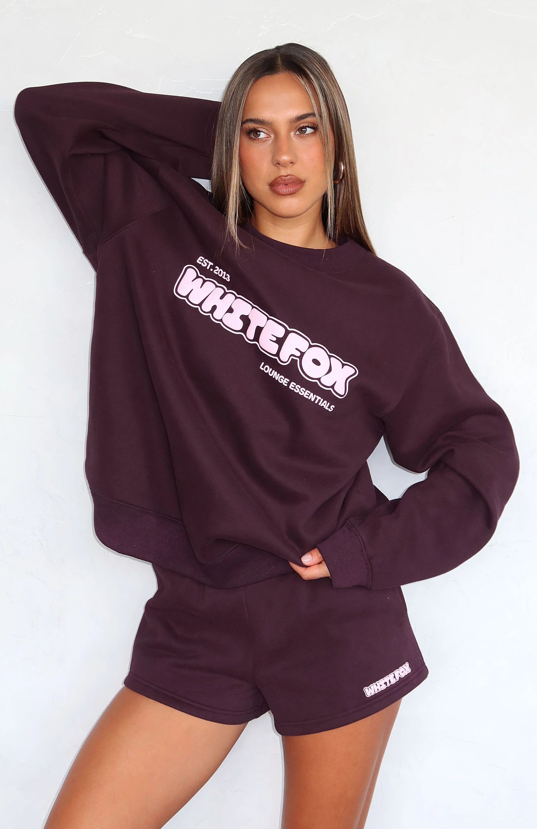 Slip into comfort with the Give It A Try Oversized Sweater in Plum! Features round neckline, slouched shoulders, long sleeve, signature puff print White Fox text centre front and ribbed neckline, cuffs and hemline. For a matching moment pair with the Give It A Try Lounge Shorts Plum.