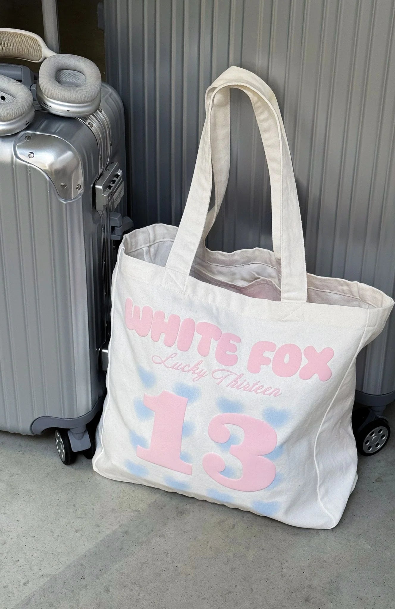 The vibe is: cute street style! The Lucky Thirteen Charise Tote Bag in Off White features dual shoulder straps, open-top design, internal pocket and puff print White Fox paired with printed love heart graphic at the front. We are in love!